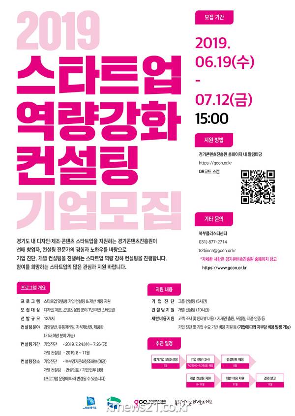 경기콘텐츠진흥원(이사장 김경표)은 ‘2019 스타트업 역량 강화 컨설팅’ 참가기업을 7월 12일까지 모집한다.