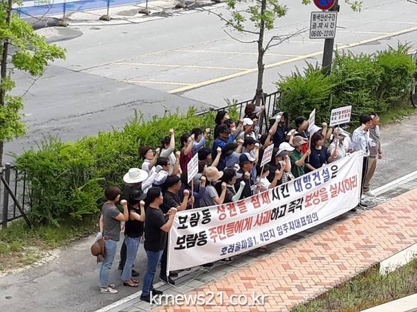 보람동(3-2생활권)에 건설중인 대방디엠시티(호려울마을7단지) 공사현장에서 호려울마을4단지와 1단지 주민 약 40여명이 정문 앞에서 건설사를 규탄하는 집회를 갖었다.