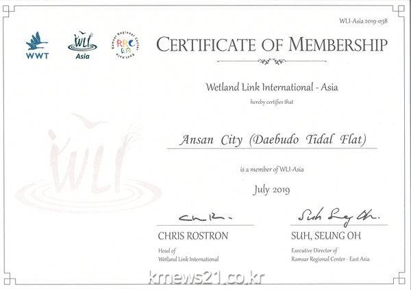 안산시(시장 윤화섭)는 국가 연안 습지이자, ‘람사르 습지’로 지정된 대부도 갯벌이 ‘아시아 습지센터 네트워크(WLI-Asia)’에 가입하고 공식인증서를 수여 받았다고 24일 밝혔다.