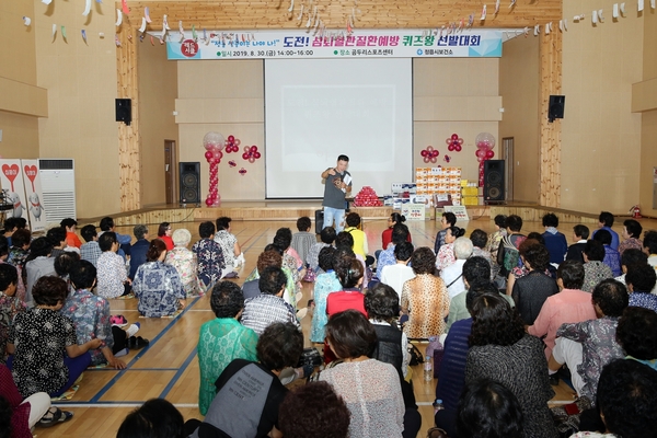 곰두리체육관에서 실시한 이번 퀴즈대회에는 150여 명이 참여해 심뇌혈관질환 건강상식에 대한 퀴즈로 열띤 경쟁을 벌였다.