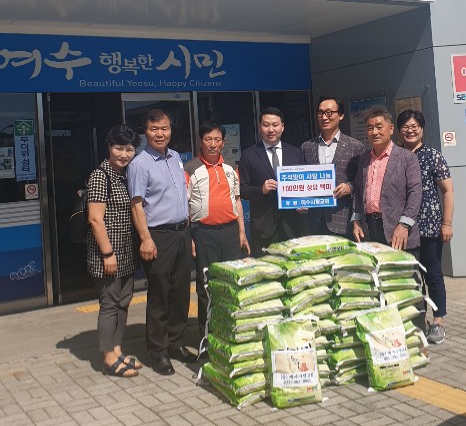 ▲ 여수시 예수사랑교회(원유성 목사, 좌 네 번째)가 지난달 30일 쌀 100만 원 상당을 여수시 만덕동주민센터에(만덕동장 류성식, 우 세 번째)에 후원했다.