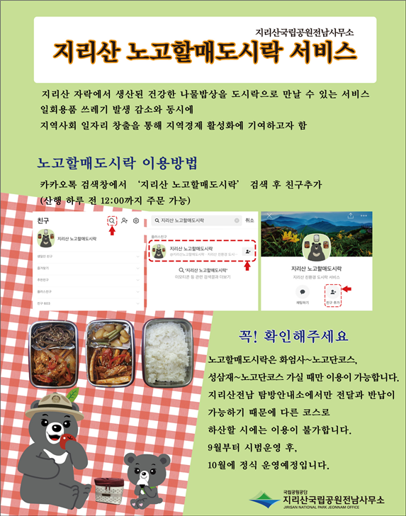□ 국립공원공단 지리산국립공원전남사무소(소장 김병채)는 9월 친환경 도시락 서비