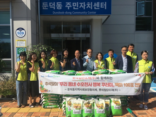 ▲ 지난달 30일 롯데첨단소재(주) 임직원이 둔덕동에 백미 100포 전달한 후 기념촬영하고 있다.