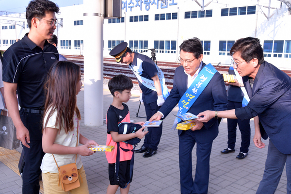 ▲ 권오봉 여수시장이 11일 오후 여수엑스포역에서 추석명절 귀성객에게 환영 인사를 하며 기념품을 전달하고 있다.
