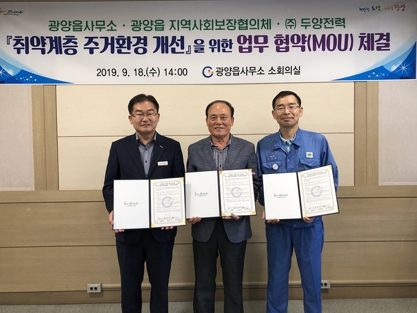 서문식)와 ㈜두양전력(대표 노경숙) 등 3개 기관·단체가 ‘광양읍 취약계층 주거환경 개선을