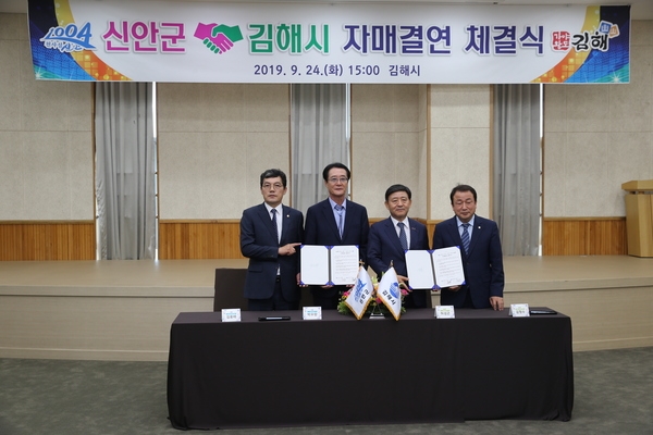 호남의 신안군과 영남의 김해시는 9월 24일 김해 중소기업비즈니스센터에서 상호 교류와 협력으로 공동 발전을 도모하기 위한「신안군↔김해시 자매결연 협약」을 체결했다.