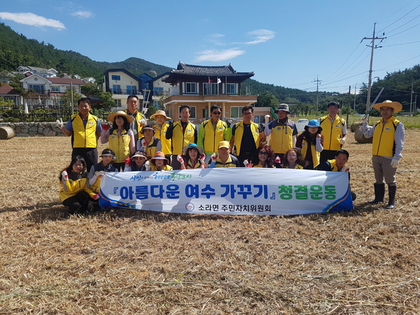 ▲ 여수시 소라면(면장 최영철)이 지난 20일 여수여자만 갯벌노을 체험행사장에서 청결활동을 했다.