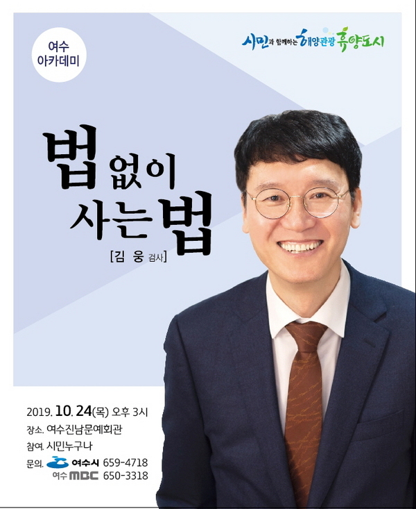 여수시는 24일 오후 3시 진남문예회관에서 김웅 검사가 ‘법 없이 사는 법’이라는 주제로 강연을 펼친다고 밝혔다.