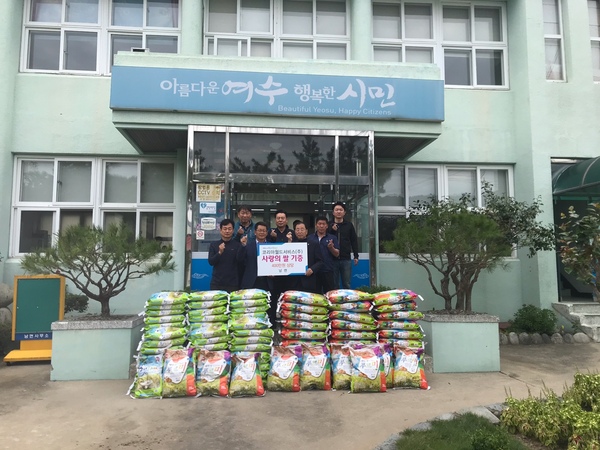 ▲ 코리아월드써비스(주)(대표 김완식)가 지난 17일 여수시 남면사무소(면장 조계완)에 쌀 400만 원 상당을 후원했다.