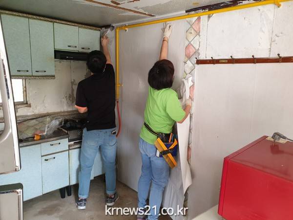 ▲ 지난달 31일 남해수산연구소 남해랑봉사회(회장 라인철) 지원으로 화양면 저소득 독거노인 세대 벽지를 교체하고 있다. 이날 사업은 남해랑봉사회 500여만 원 상당의 지원으로 추진되었다. 2011년에 직원 43명으로 구성된 남해랑봉사회는 회비를 모아 저소득 세대에 다양한 사업을 꾸준히 펼치고 있다.