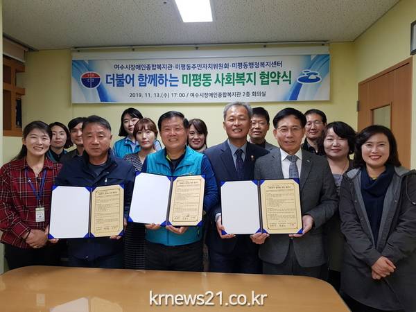 여수시 미평동 행정복지센터와 주민자치위원회가 지난 13일 오후 여수시장애인복지관과 ‘사회복지 발전 협약’을 체결했다.