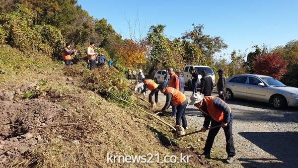 여수시 율촌면이 지난 14일 ‘앵무산 등산로 단풍나무 숲길 조성 사업’을 펼쳤다고 15일 밝혔다.