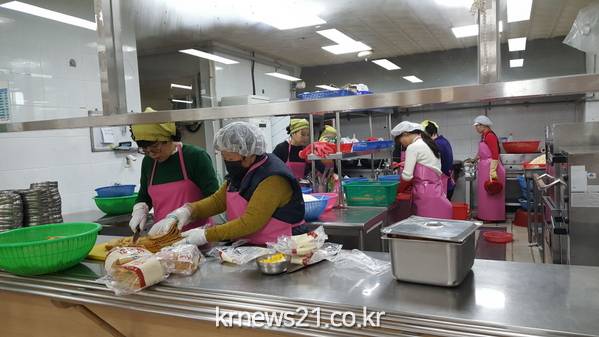 이날 회원 10여 명은 복지관 이용 어르신들의 식사준비와 배식, 설거지에 구슬땀을 흘렸다.