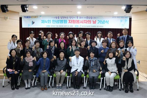 경기도의료원 안성병원(병원장 임승관)은 11월 26일 안성병원 2층 대강당에서 ‘제4회 자원봉사자의 날 기념식’을 개최했다. 이 날 행사는 안성병원 사랑나눔 봉사회 회원 38명을 초청하여 진행되었으며 자원봉사자의 노고 격려 및 봉사의식 고취, 병원 자원봉사 활성화를 위한 목적으로 개최되었다.