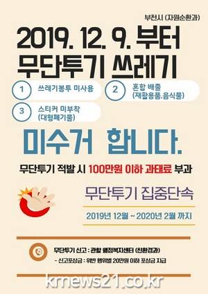▲ [사진=안내포스터]부천시는 거리 및 주택가에 무분별하게 무단투기한 생활폐기물을 수거하지 않는 “무단투기 미수거 시책”을 오는 9일부터 시행한다고 3일 밝혔다.