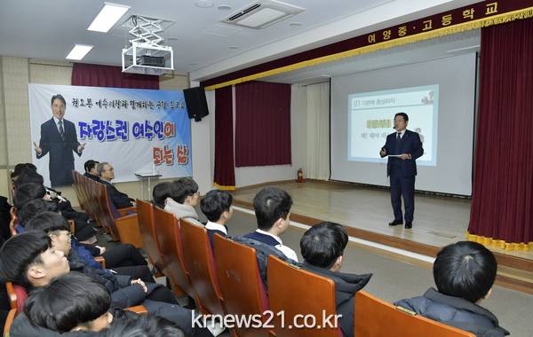 권오봉 여수시장이 9일 오후 여양고등학교 시청각실에서 ‘자랑스러운 여수인이 되는 삶’이라는 주제로 특강을 펼쳤다.