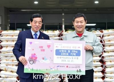 ▲ [사진제공 = 안산시]안산시(시장 윤화섭)는 17일 안산스마트허브에 소재한 대덕GDS노동조합으로부터 관내 저소득 소외계층을 위해 사용해 달라며 ‘사랑의 쌀’ 20㎏ 100포를 기탁 받았다.