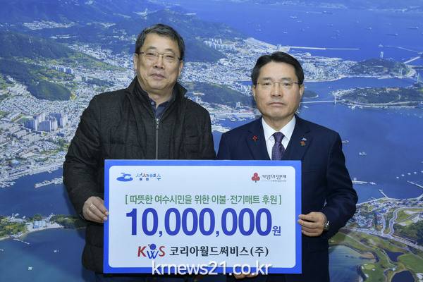 여수지역에서 지속적인 나눔활동을 하고 있는 코리아월드써비스(주)(대표 김완식)는 지난 21일 여수 시민의 따뜻한 겨울나기를 위해 1천만 원 상당 이불과 전기매트를 후원했다.