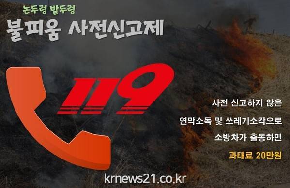 고창소방서(서장 백승기)는 봄철 영농준비로 인한 논·밭두렁 및 농업용 폐기물 소각이 본격화됨에 따라 화재를 예방하기 위한 ‘불피움 사전신고제’를 운영한다.