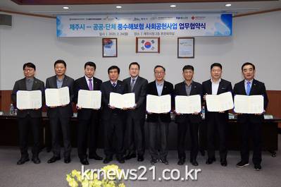 제주시에서는 제주국제자유도시개발센터, 제주개발공사, 농협중앙회제주지역본부, 대한건설협회제주특별자치도회, 대한주택건설협회 제주특별자치도회, 대한건축사협회 제주특별자치도건축사회, 대한적십자사 제주특별자치도 지사가 참여하는 풍수해보험 사회공헌사업 공동추진을 위한 업무협약을 ‘20.2.24일자로 체결했다고 밝혔다.