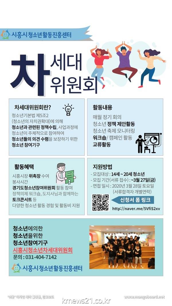 시흥시에 거주하고 있는 14∼20세 청소년 이라면 누구나 신청이 가능하다. 청소년 차세대위원회로
