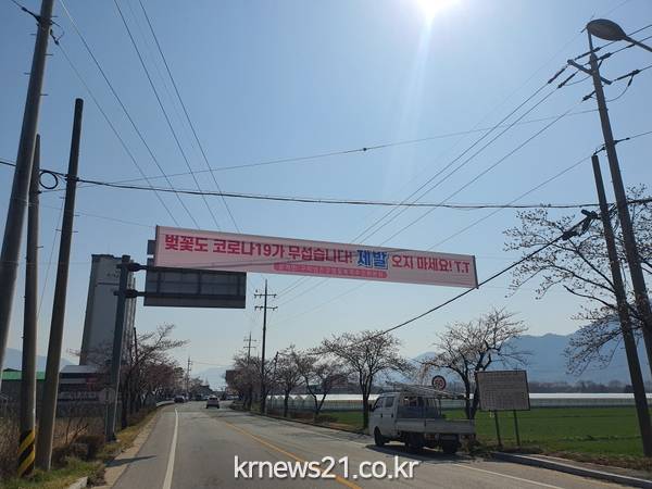 ▲ 군청앞 현수막전남 구례군(군수 김순호)는 섬진강 벚꽃이 개화함에 따라 주차장과 일부 진입도로를 폐쇄하는 등 강도 높은 방역대책에 나섰다고 25일 밝혔다.
