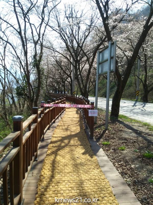 ▲ 마을앞 데크길 폐쇄주요 길목에는 방문을 자제해달라는 현수막도 걸렸다. 벚꽃길 외곽에 위치한 주차장에는 열화상카메라를 설치하고 방역초소를 운영한다.
