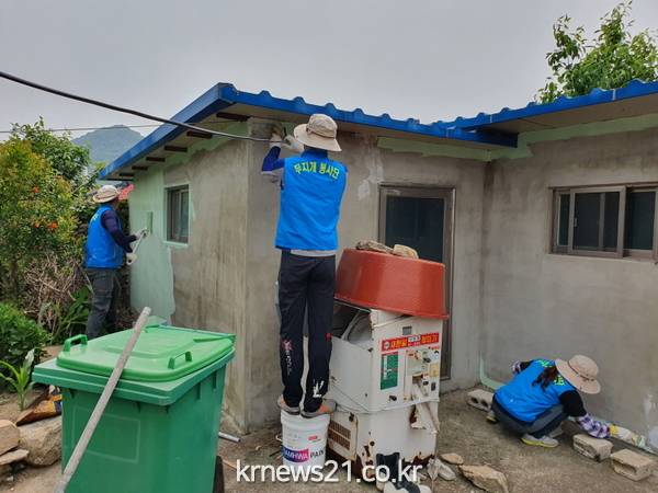지난 7일 무지개봉사단원 10명이 읍동마을 독거노인가구 집을 찾아 페인트 도색 활동을 펼쳤다.