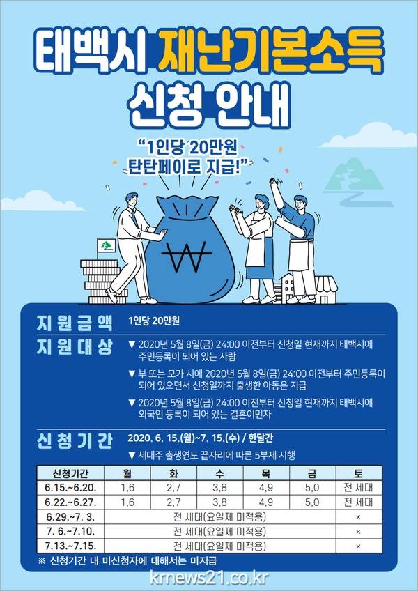 태백시가 오는 15일부터 한달 간 ‘태백시 재난기본소득’ 신청을 접수한다.