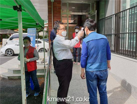황연동 통장협의회는 민원 혼잡을 대비해 매일 3명씩 조를 편성, 동 청사 곳곳에서 발열 체크 및 번호표 배부, 거동불편 어르신들의 이동 등을 돕고 있다.