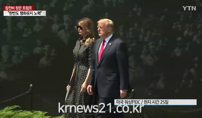 ▲ [사진출처 = YTN 뉴스 캡처]도널드 트럼프 미국 대통령이 한국전쟁 발발 70주년인 25일(현지시각) 오전 11시 10분 미국 워싱턴DC에 있는 한국전 기념공원을 방문해 헌화했다.