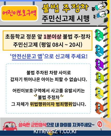 주민신고제는 △도로모퉁이 △소화전 △버스정류장 △횡단보도 주변 등의 불법주‧정차 차량을 신고하는 제도이다. 이는 최근 강화되고 있는 어린이보호구역 내 안전조치의 일환으로 기존 4대 불법주정차 금지구간에 어린이보호구역을 포함해 전국적으로 시행하게 된다.