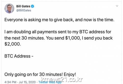 15일(현지시간) AFP 통신 등에 따르면 해커들은 이들의 계정에 탈취한 뒤 '지정된 암호화폐 계좌로 30분 안에 1천달러(약 120만원)를 비트코인으로 보내면 돈을 두배로 돌려주겠다'는 글을 올렸다.