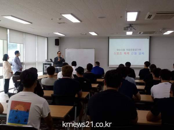 여수시(시장 권오봉)는 지난 21일 진남스포츠센터에서 최근 체육계에서 일어나고 있는 인권침해 행위를 예방하기 위해 여수시청 직장운동경기부를 대상으로 스포츠(성)폭력 근절 교육을 실시했다고 밝혔다.