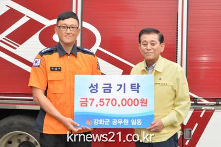 군은 안타까운 소식에 빠른 쾌유를 기원하며 유천호 군수를 비롯한 군청 직원들의 자발적 참여로 7백5십여 만원을 모금했다. 이날 유 군수는 강화소방서 송해면 119구조대에 방문해 직원을 대표해 소방공제회를 통한 지정기부금으로 기탁했다.