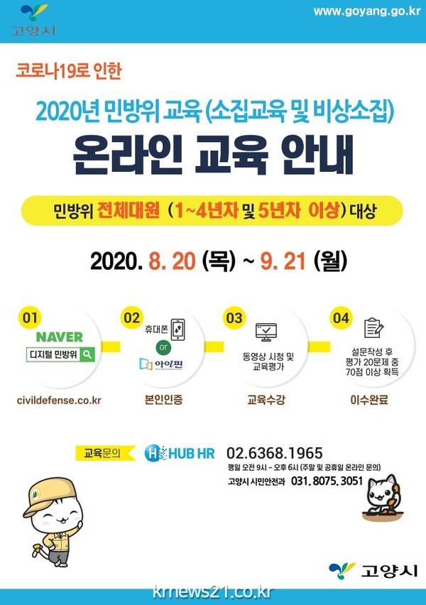 고양시(시장 이재준)는 코로나19 감염 예방을 위해 2020년 민방위교육을 사이버교육으로 대체해 추진한다고 밝혔다.