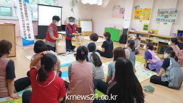 사)세계건강생활진흥연맹 (조안순 회장)이 비영리민간단체 보조금으로 진행하는 찾아가는 응급처치 (심폐소생술) 및 자동심장충격기 사용법 교육을 광주 광산구 장애인복지관 내 해솔빛어린이집 교직원들을 대상으로 9월 24일 오후 4 시 30분 ~6 시 30 분까지 실시하였다.