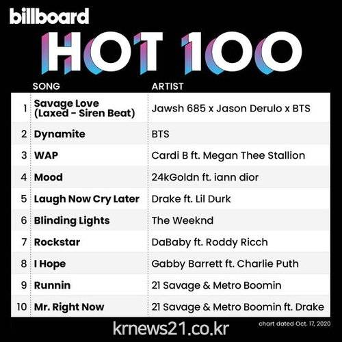 이번 주 핫 100 차트에서는 '새비지 러브' 리믹스에 이어 '다이너마이트'가 2위를 차지하며 방탄소년단 곡이 나란히 1·2위에 오르는 대기록도 세웠다.