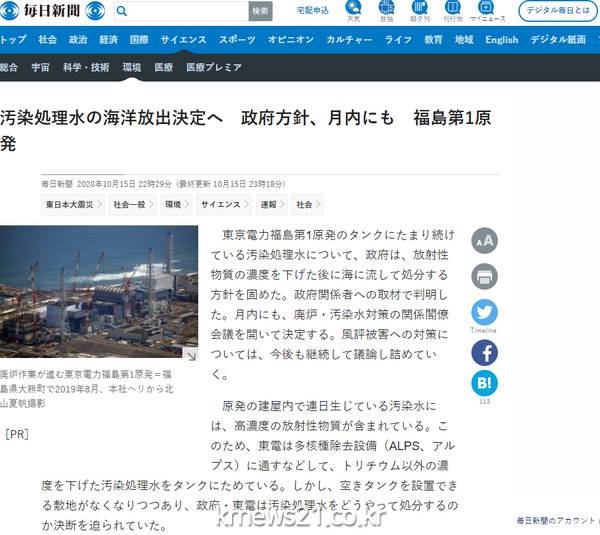 ▲ [이미지출처 = 마이니치신문 홈페이지 캡처]일본 정부가 도쿄전력 후쿠시마(福島) 제1원전 오염수(일본 명칭 '처리수')에 대해 방사성 물질의 농도를 낮춘 후 바다에 방류해 처분한다는 방침을 굳혔다고 마이니치(每日)신문이 정부 관계자를 인용해 15일 보도했다.
