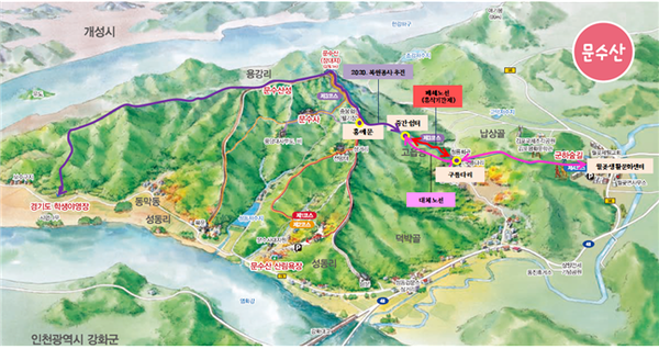 해발 376m의 문수산은 한남정맥 최북서쪽에 위치한 김포의 대표적인 산으로 ‘김포의 금강산’이라 불리며 김포의 명소 중 하나로 손꼽힌다.