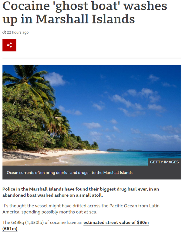 ▲ [이미지출처 = BBC 홈페이지 캡처]남태평양의 섬나라 마셜 제도의 섬에 좌초된 유령선 갑판 아래서 649kg의 코카인이 발견됐다. 돈으로 환산하면 약 8천만달러(한화 약 874억원)에 달한다.
