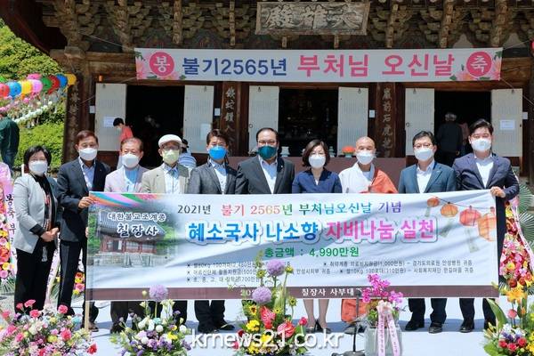 지난 19일 칠장사(주지 지강스님)는 불기 2565년 부처님 오신날을 기념하여 봉축법요식에서 쌀 10kg 800포(2480만원 상당)를 안성시에 전달했다. 칠장사는 지난 2018년 안성시와 이웃사랑 희망나눔 업무협약을 체결한 이후 지속적으로 안성시에 나눔을 실천하고 있다. 칠장사 주지 지강스님은 부처님 오신날을 맞아 나소향 나누고 소통하여 향기로운 세상을 만들자 을 실천하여 지역사회 내 어려운 이들을 돕고 어려움을 함께 나누고자 이번 자리를 마련했다. 앞으로도 어려운 이웃들과 함께 나누고 소통하고자 노력하겠다 고 밝혔다. 이날 법요식에 참석한 김보라 안성시장은 꾸준한 나눔 활동을 통해 지역사회 내 어려운 이웃들을 돕고 있는 지강스님께 감사의 말씀을 드린다. 코로나19가 오랫동안 지속되며 어려운 이들이 더욱 많아지고 있는데 오늘 나눔을 통해 전해주신 큰 사랑을 잘 전달하겠다 고 말했다. 한편 칠장사는 이날 행사를 통해 안성시 외에도 안성 유관단체 4곳에 약 2510만원의 기탁금 및 물품을 전달하며 나눔의 의미를 더했다.