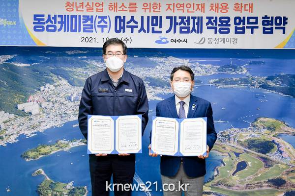 이번 협약에 따라 동성케미컬(주)은 신규 인력채용부터 여수시민가점제를 적용하며, 지역인재 채용률 증진과 더불어 지역발전을 위해 더욱 협력해 나가기로 했다.