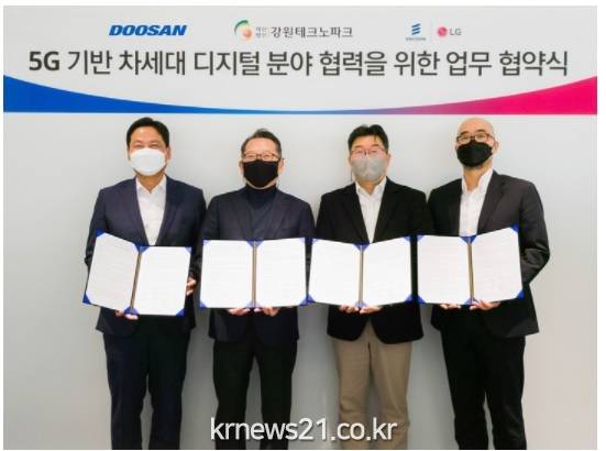 두산중공업은 강원테크노파크, 에릭슨엘지, ㈜두산 디지털이노베이션(DDI)과 ‘5G 기반 차세대 디지털 분야 협력을 위한 업무 협약’을 체결했다고 10일 밝혔다.