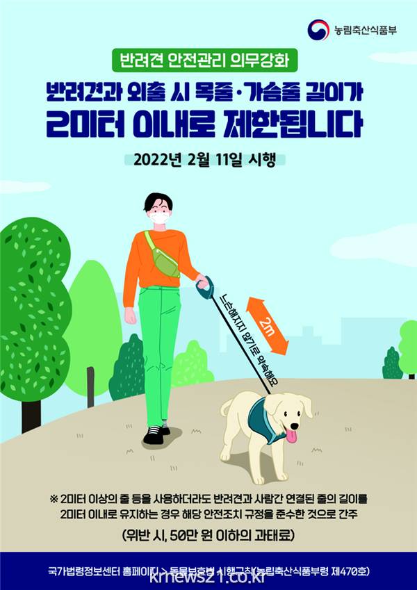 또한 “외출 시 목줄과 가슴줄의 길이를 2m 이내로 유지하는 것은 돌발 상황이 발생하거나 위험에 노출되었을 때 타인과 다른 동물을 보호하는 동시에 내 반려견을 안전하게 보호하는 데도 효과적인 조치”라며 반려견 소유자의 이해와 참여를 당부했다.