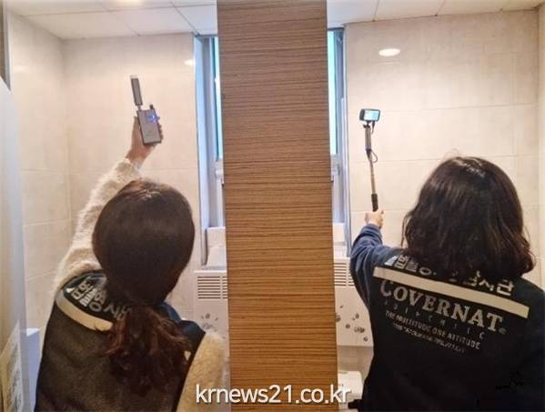 ▲ 사진=은평구 / 불법촬영 점검 모습서울 은평구(구청장 김미경)가 불법촬영 범죄에 대한 사회적 불안감을 해소하고 사전에 예방하고자 공공·민간화장실 대상 정기점검을 지원한다.