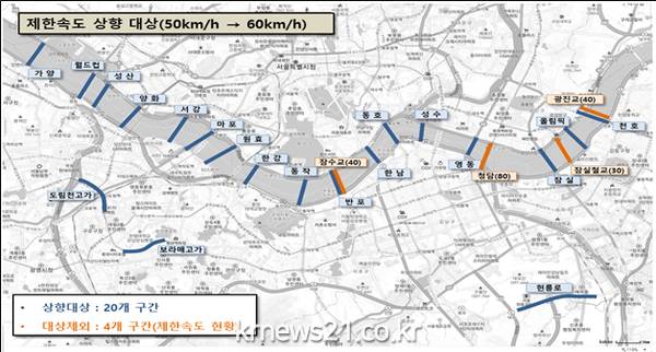 서울시는 서울경찰청과 협의를 거쳐 보행자가 많지 않고 차량소통이 비교적 원활한 한강교량 등 20개 구간의 기존 제한속도를 시속 50km에서 60km로 상향한다고 밝혔다. 보도가 없어 보행자가 접근하기 어렵거나 밀도가 낮아 속도를 상향해도 안전사고 위험이 낮고, 차량소통이 비교적 원활해 속도를 상향할 필요가 있는 구간이다.