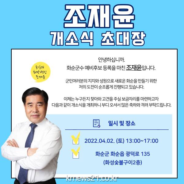 예산 전문가 행정 전문가라는 타이틀을 가지고 있는 조재윤 화순군수 예비후보가 오는 4월 2일 토요일 오후 1시~5시 화순군 화순읍 광덕로135 (화성숯불구이2층 ) 에서 선거사무소 개소식을 갖는다.