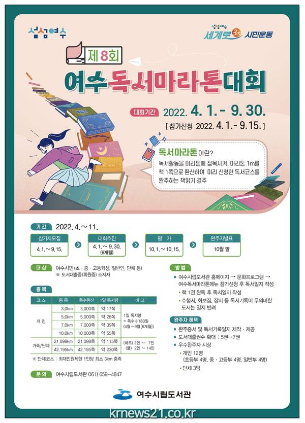 ▲ 사진=여수시여수시가 책 읽는 문화 형성을 위해 4월 1일부터 9월 30일까지 6개월간 ‘제8회 여수독서마라톤대회’를 개최한다.