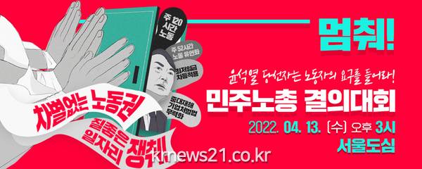 민주노총은 오늘(13일) 오후 서울 도심에서 윤석열 대통령 당선인의 노동개혁 정책을 규탄하고, 민주노총이 제안한 대화를 촉구하기 위한 결의 대회를 개최한다.